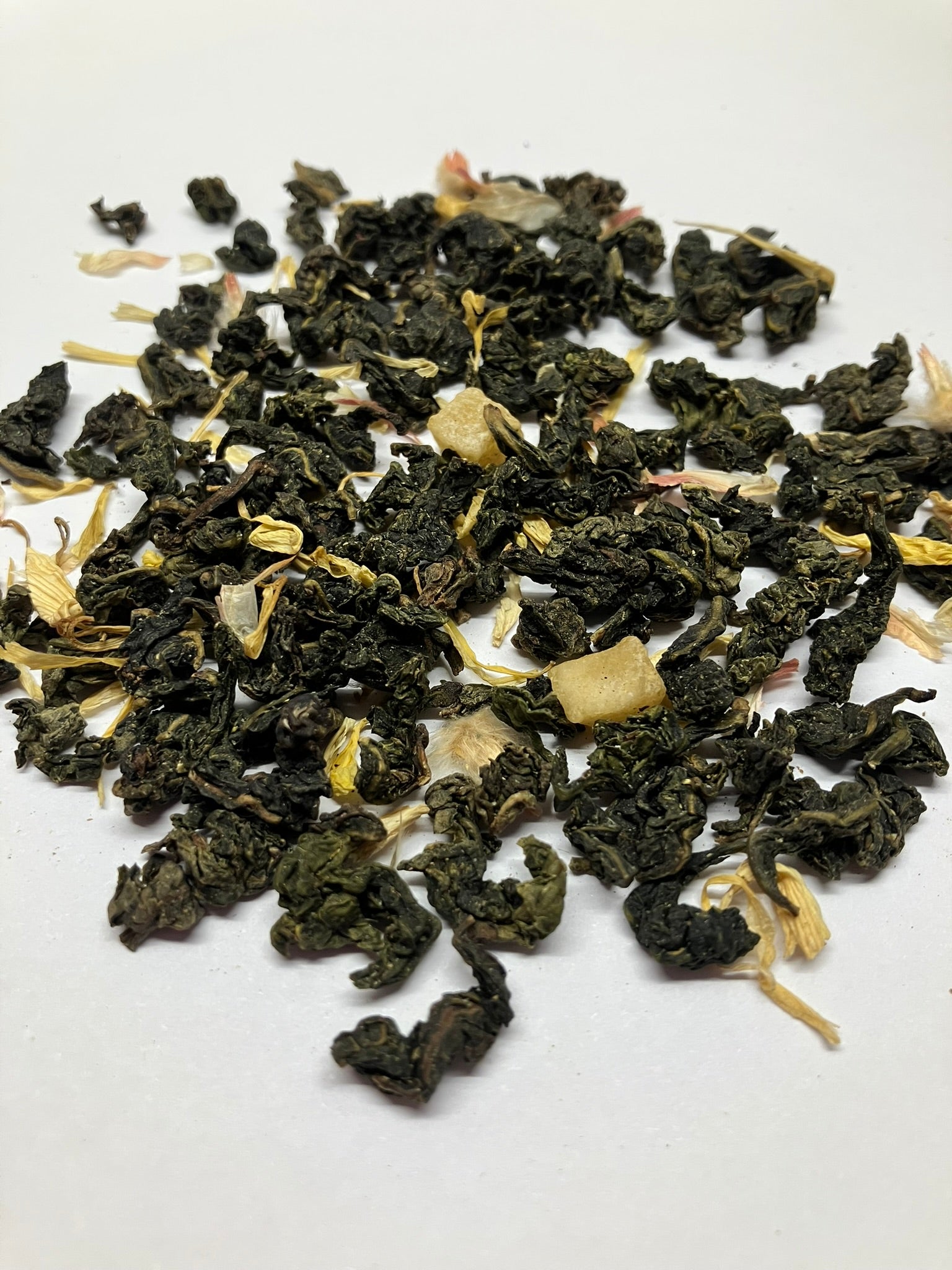 Ingredients: Oolong tea with natural peach pieces; calendula, sunflower, and marigold petals.